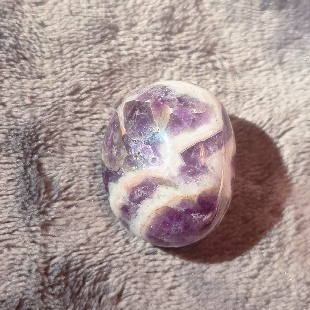 Φυσικός λίθος αμέθυστου σε απαλή απόχρωση λεβάντας, με φυσικές ζώνες γαλακτώδους χαλαζία. Κάθε πέτρα είναι μοναδική, με εσωτερικές διαδρομές φωτός που αποκαλύπτονται διαφορετικά ανάλογα με τον φωτισμό.