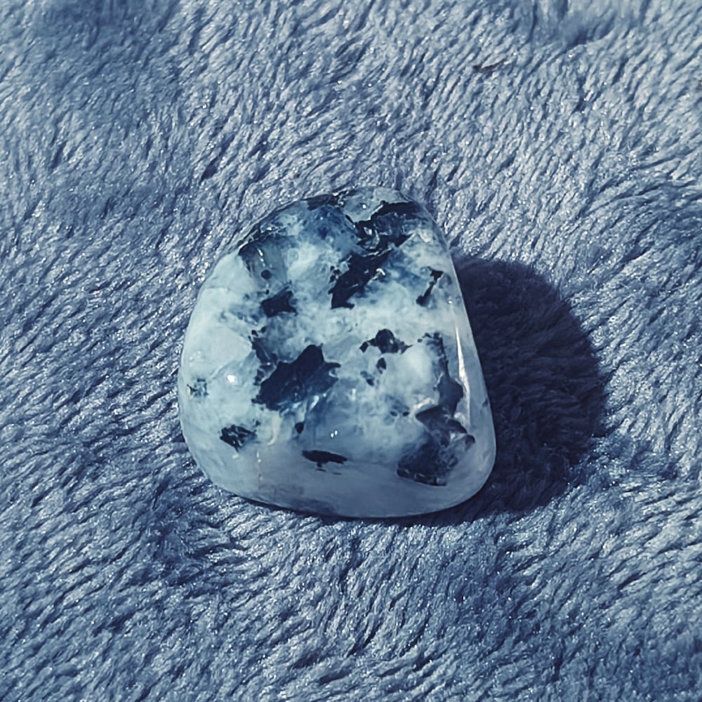 Φεγγαρόπετρα με έντονα μαύρα εγκλείσματα (πιθανός τουρμαλίνης / βιοτίτης), που δημιουργούν έντονη αντίθεση και βάθος στο φως.